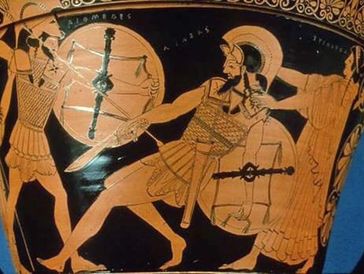 [Image: vase painting, Classical era: Diomedes is spearing Ares, the God of War, in his guts—with Athene's help.]